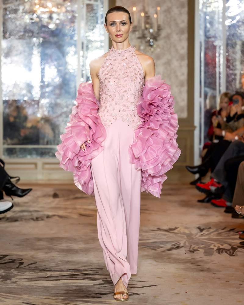 House of Rina presented the Gulabi Pink Couture Collection, a graceful yet powerful homage to feminine resilience and empowerment. Inspired by the women-led Gulabi Gang movement in India, known for their symbolic hot-pink saris, the collection featured silk charmeuse, satin, hand-sewn feathers, and over 200 hours of intricate embellishment.