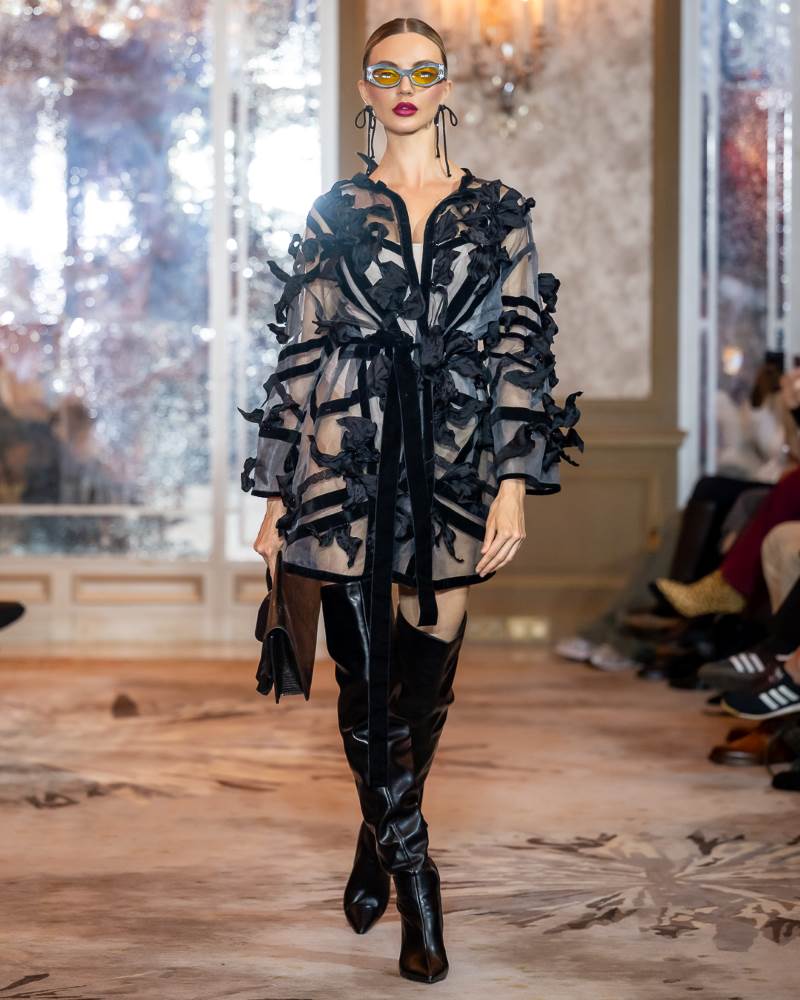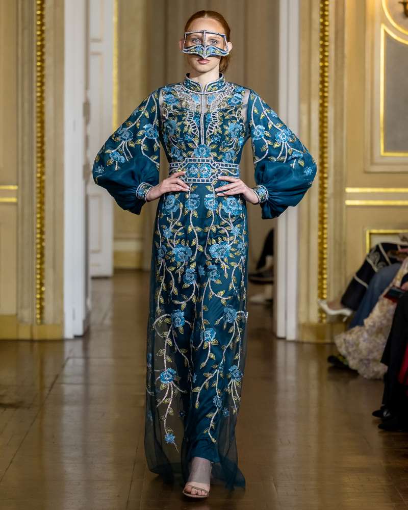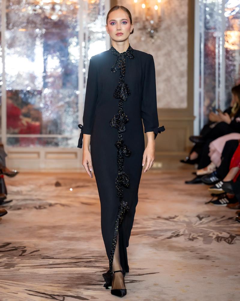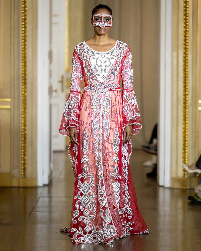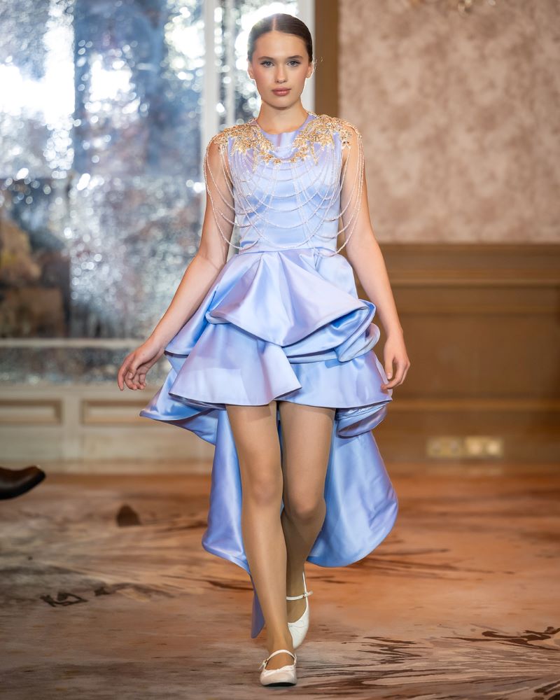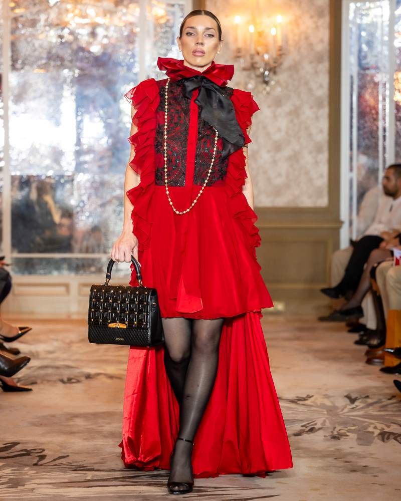 Keti Chkhikvadze, designer of MAISON KETI, unveiled a striking collection defined by sculptural silhouettes, cascading movement, and a celebration of unapologetic femininity. Signature to her style, the looks combined structured volume with fluid motion — from tiered ruffles in playful polka dots and vivid florals to romantic white ensembles crafted from sheer tulle and petal-like appliqués. Bold red and electric blue prints evoked joy and nostalgia, while black and white looks added a sense of timeless drama with hand-embroidered gold motifs and velvety textures. Each piece danced between tradition and fantasy, capturing the spirit of a woman who is powerful yet poetic, grounded in heritage yet unafraid to dream.