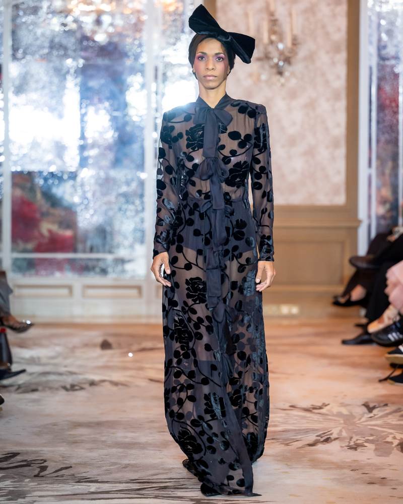 IRA LANGEVIN — the fashion house founded by designer, playwright, and diplomat Ira Langevin — presented her collection “She Who Knows.” It is not simply a collection — it is a manifesto. The collection presents a striking dialogue between softness and strength, where sculptural silhouettes meet fluid movement. Ethereal gowns in lavender gradients float like mist, crafted from delicately pleated fabrics that cascade around the body with weightless grace. Black-and-white geometric compositions add a graphic edge, while voluminous whites adorned with feather-like detailing introduce a sense of celestial purity. Built on duality, it contrasts architectural structure with fluid drapery, concealment with bold cuts — reminding us that true strength is not loud, but deeply felt.