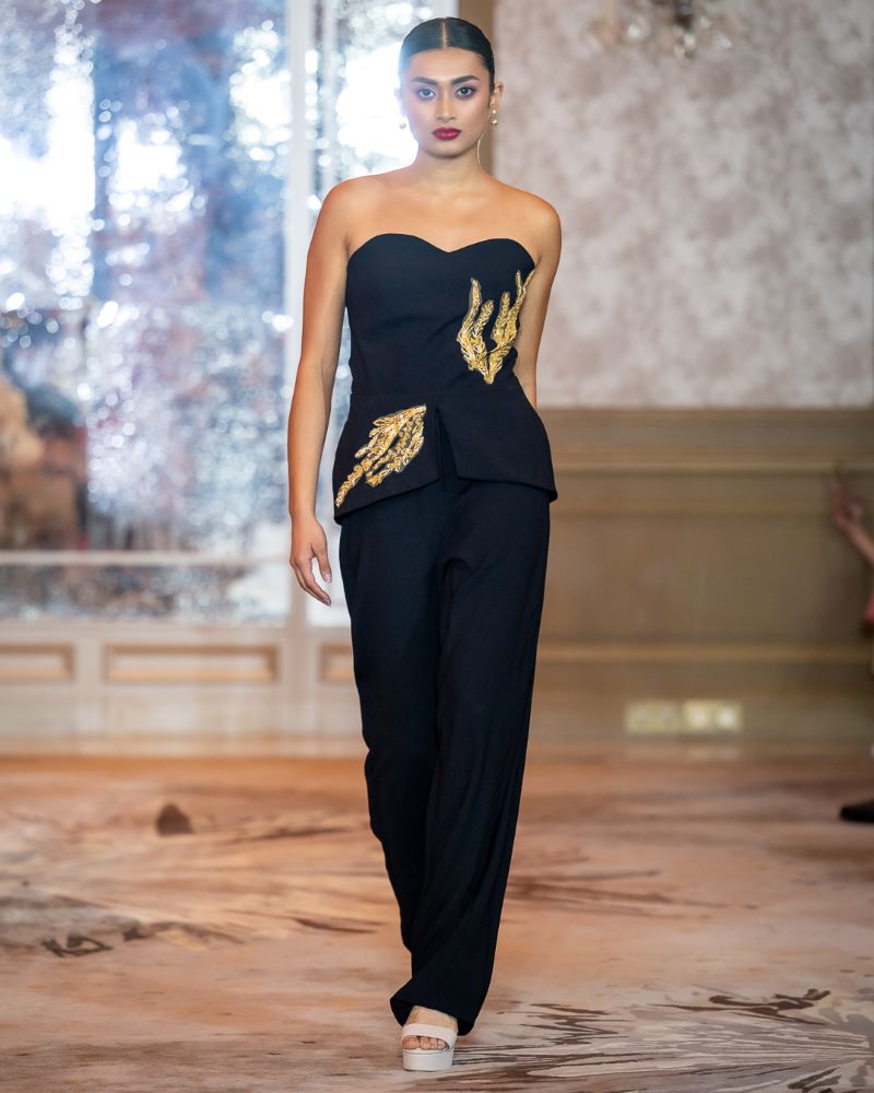 Drawing inspiration from his acclaimed Metamorphosis Collection, the showcase embraced sustainability and versatility through transformative silhouettes, reversible constructions, and dynamic draping — allowing each garment to shift effortlessly from day to night. The collection reaffirmed Abraham’s position as a designer who merges glamour with purpose, delivering couture that is not only striking but intelligent in its design.