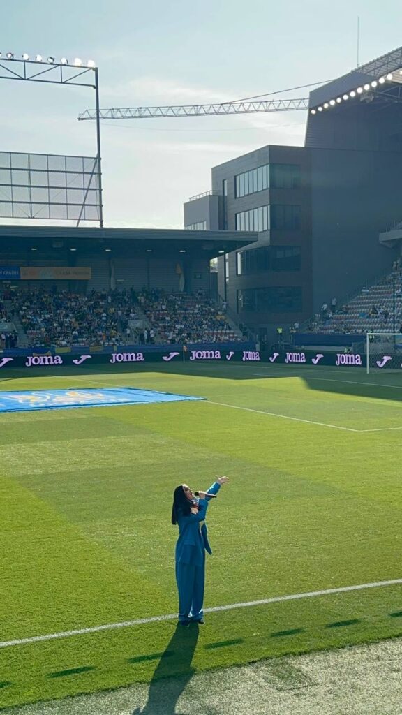 YATSUTA з’явилася на стадіоні в одязі в синьо-жовтих кольорах, тримаючи український прапор у своїх руках. Відчувши енергетику вболівальників, виконавиця не змогла стримати сліз.